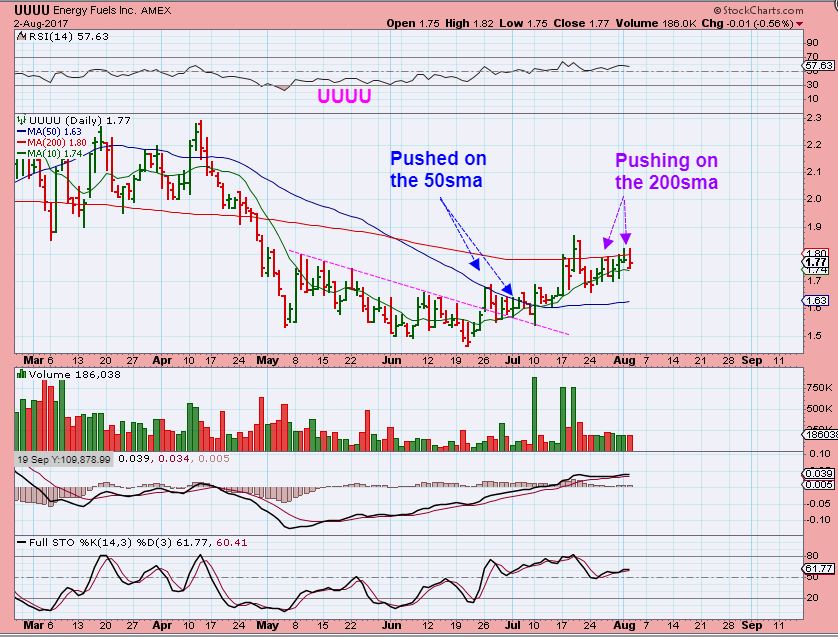 UUUU – I have been watching UUUU. It is pushing on the 200sma and could break out ( It is on my Watch list).