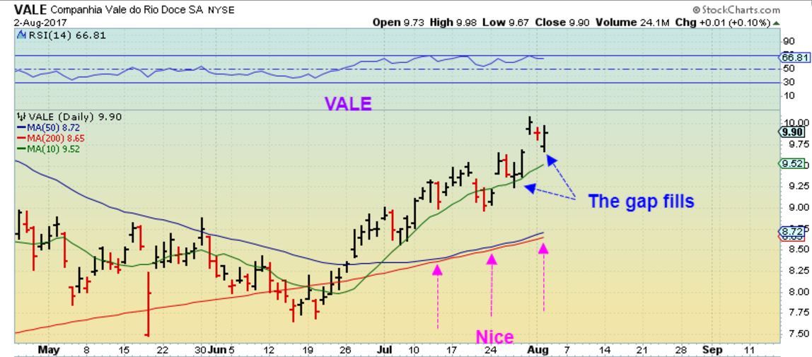 VALE – When VALE gapped up on July 31, I pointed out that the Gap Up on July 25th actually dropped and filled that gap in 3 days, so this would be something to watch for and see if this gap fills at the 10sma too. That could be a buy opportunity.