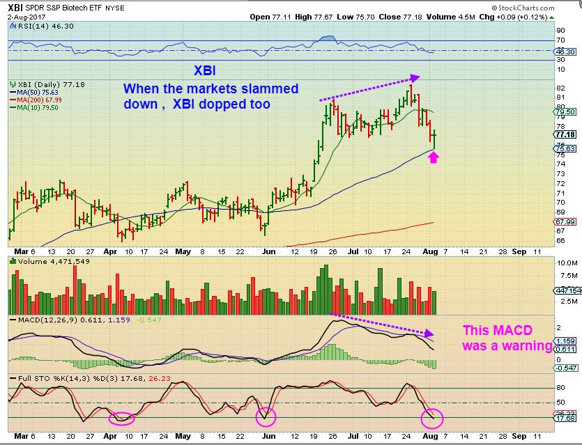 XBI – I was also watching IBB & XBI. With that general Market slam down, the XBI dropped to the 50sma. Yesterday saw a reversal off of the 50sma and it got oversold, so this may be a low risk entry, with a stop under the 50sma ( Somewhat loose stop if you can afford to do that).