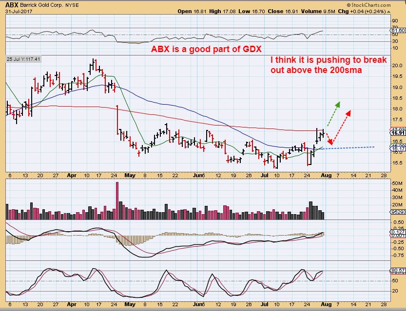 ABX – After earnings were released, ABX moved higher from a 1 day slam last week, and is trying to break out above the 200sma now. It has the same story as NEM, it could break out if Gold moves higher, or pause and build energy to break out.