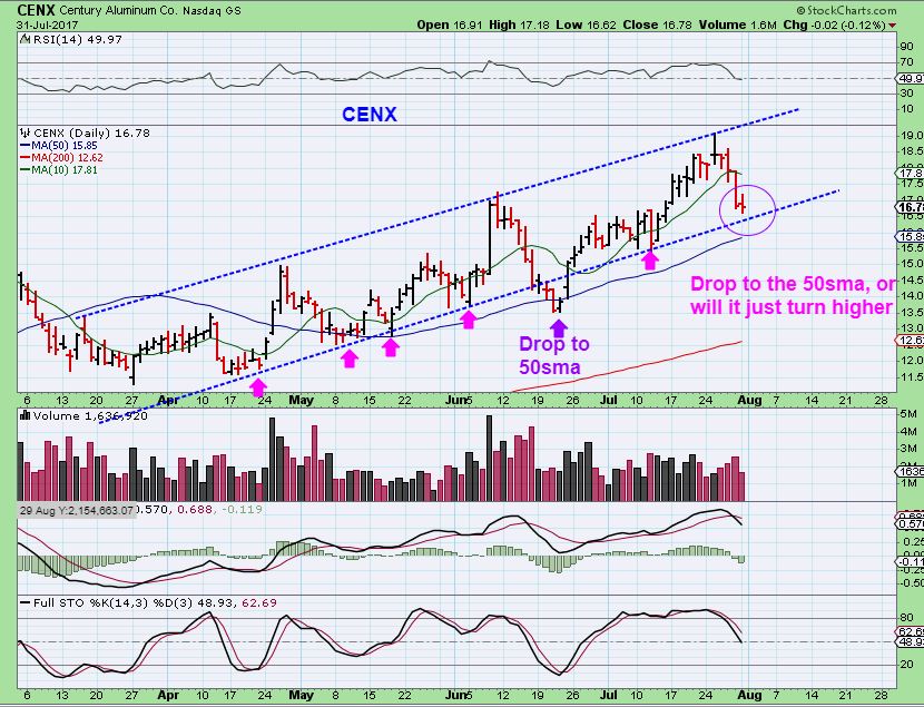 CENX DAILY – Notice that CENX drops toward the 50sma and then takes off higher to new highs again. CENX may drop to the 50sma, or just hold on that lower channel line. It is almost a buy right here.