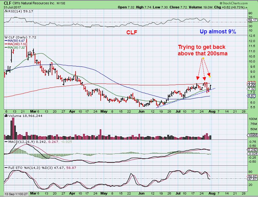 CLF – CLF is pushing against the 200sma, and moved higher by almost 9% Monday. This is also a place of support if someone wanted to add to their position. It MIGHT drop to the 50sma too however.