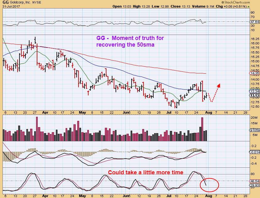 GG – GG also slammed down last week and is starting to move higher, but this could be a weak bear flag and stall at the 50sma if Gold doesn’t burst higher too.