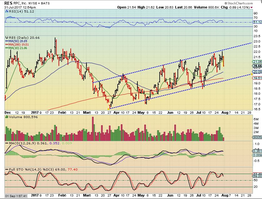 RES – This was leading too, but you can see that it is in a rising channel, and may drop to the 50sma or even the bottom of the channel & 200sma. When it gets there, it may be a good entry point.