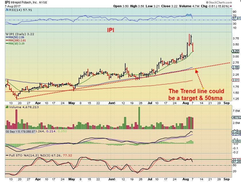 IPI – IPI dropped to the 10sma on Monday, and sometimes that acts as support. It could form a big bull flag here, but IPI is still extended , so it could also continue lower. How deep? I would say that it could drop as deep as the 50sma (and an uptrend line). Picture an a-b-c down. I still own 1/2 of my position purchased in June and would consider adding or selling a break of the 10sma and re-entering down there.