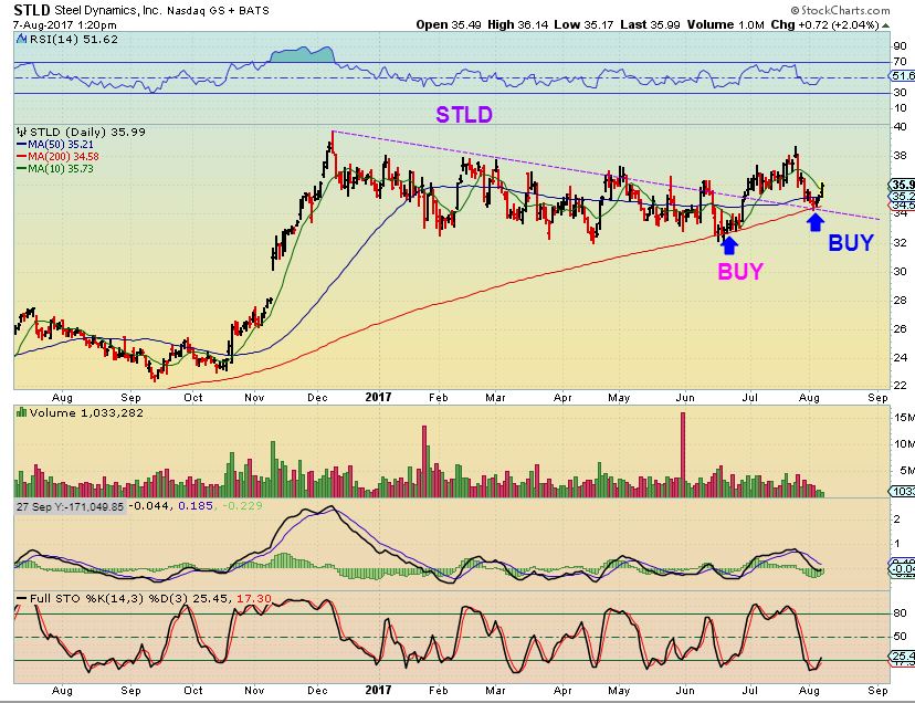 STLD – We have a break out & a back test of the 200sma and the 50sma. This is a buy with a a stop under that 200sma (red line).