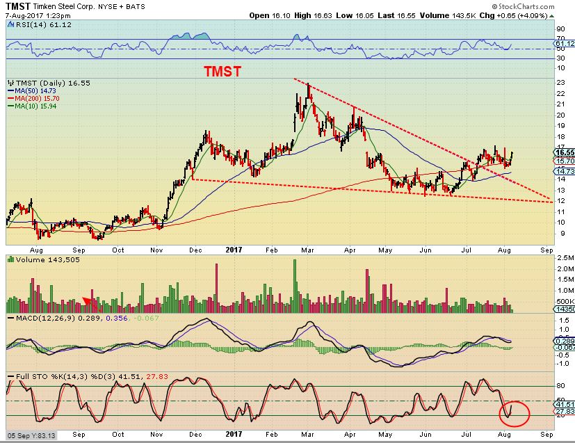 TMST – TMST broke above the 200sma and has been riding it for a while now. Both the 50 & 200sma are sloping upward, and this is bullish in the bigger picture too. TMST went from$12 + to $17+ since June and looks ready to move toward $20- $23 Soon. I did not check if their earnings are out, please do so before entering these trades.