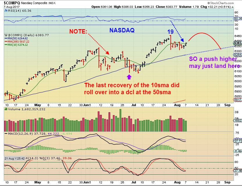 NASDAQ – Notice that in June, after that 1 day slam, the NASDAQ went sideways, regained the 10sma, and then dropped to the 50sma. At this stage of the daily cycle, I would not expect this to just run higher from here.