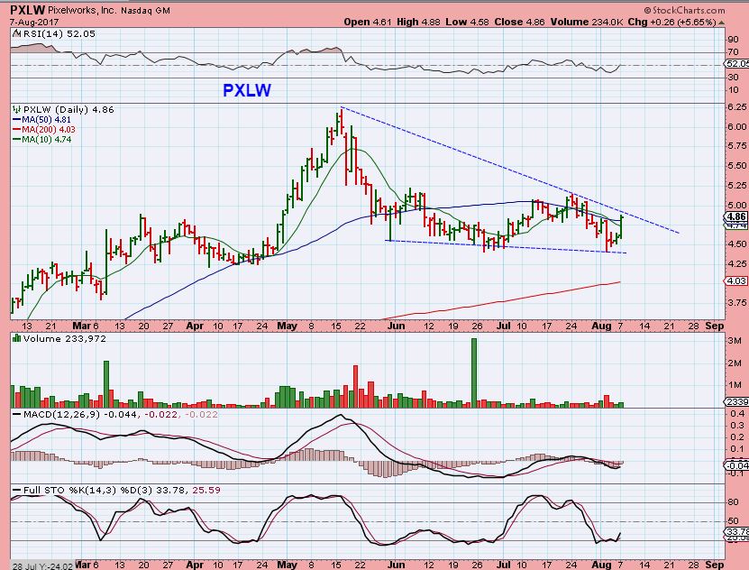 PXLW – It sold off with the NASDAQ & formed what did look like this H&S. As of Monday, it looks to be negating that H&S, and closed above the 50sma, so I am watching the trend line. This is back on my watchlist and I would buy it if it closed above $5.00.