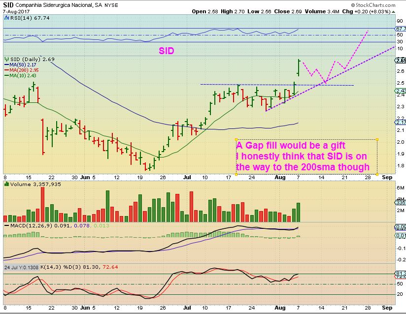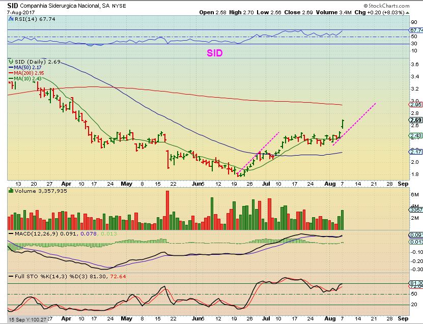 SID – Sid was a nice set up, especially since STEEL itself is bullish. June saw SID breaking a downtrend at $1.75. JULY 11 saw SID breaking out near $2. 15 and a target of $3.00