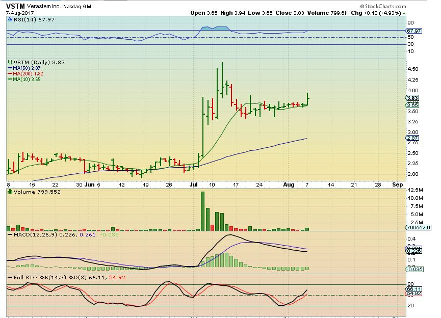 VSTM – I pointed out this tight pattern, and they can really break out bullishly. The problem was that VSTM is due to release earnings later this week and it is biotech, so I did not want to take a position, I wanted this on our watch list. Biotechs can get SLAMMED if something goes wrong, so again, I wanted this to go on the watch list until earnings….and then…