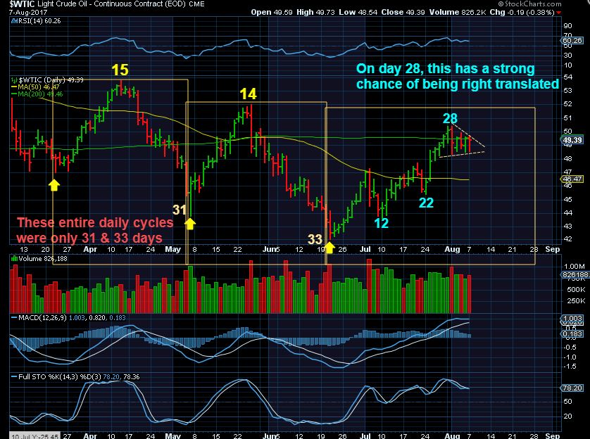 WTIC – Notice that the prior runs peaked around day 15 & 14 and were left translated with the entire daily cycle running around 33 days. We are almost on day 33 and the peak is on day 28, so this has a good chance of being r.t. ( And we expected this to be the ICL). A drop to the 50sma is not out of the question as Oil struggles at the 200sma.