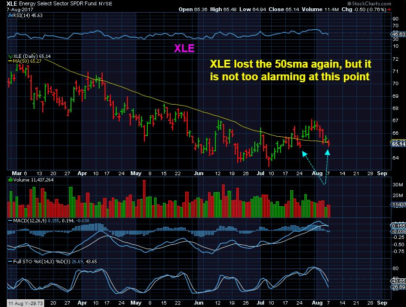 XLE – I noticed that the XLE slightly lost the 50sma again, but with Oils count as shown above, I started to think that even a rop here should make a higher low…