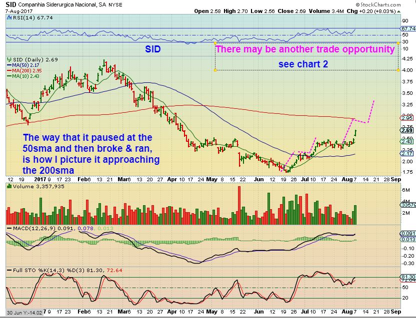SID – Sid ran to the 50sma, went sideways and broke above. I thought that maybe it will run to the 200sma at $3.00 , slide sideways , and break higher too. SO DID YOU MISS THE MOVE? Maybe, maybe not. Read this chart and then see the next chart…