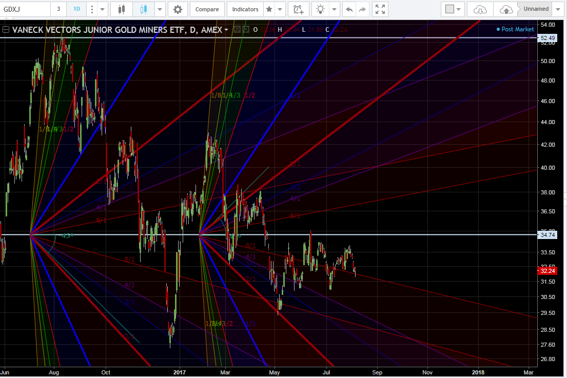In the event that the next daily cycle in gold fails, the miners’ charts are setting up to make some interesting moves down which will fulfill several chart requirements, satisfy a backtest to a solid 4-year support line, wipe out any remaining positive sentiment to set up for an awesome wave 3 up beginning in ~september, and accomplish all of this while not doing any technical damage to the charts.