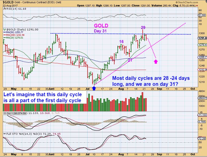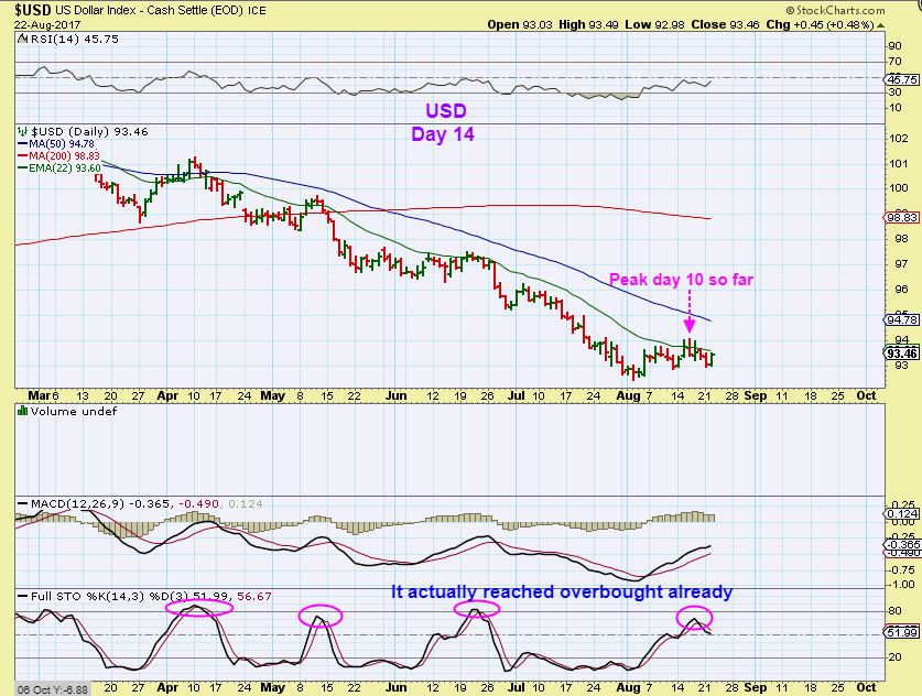 USD – The USD is still meandering sideways and has peaked on day 10 so far. This is where most left translated daily cycles would top, so this is an important area for the USD.