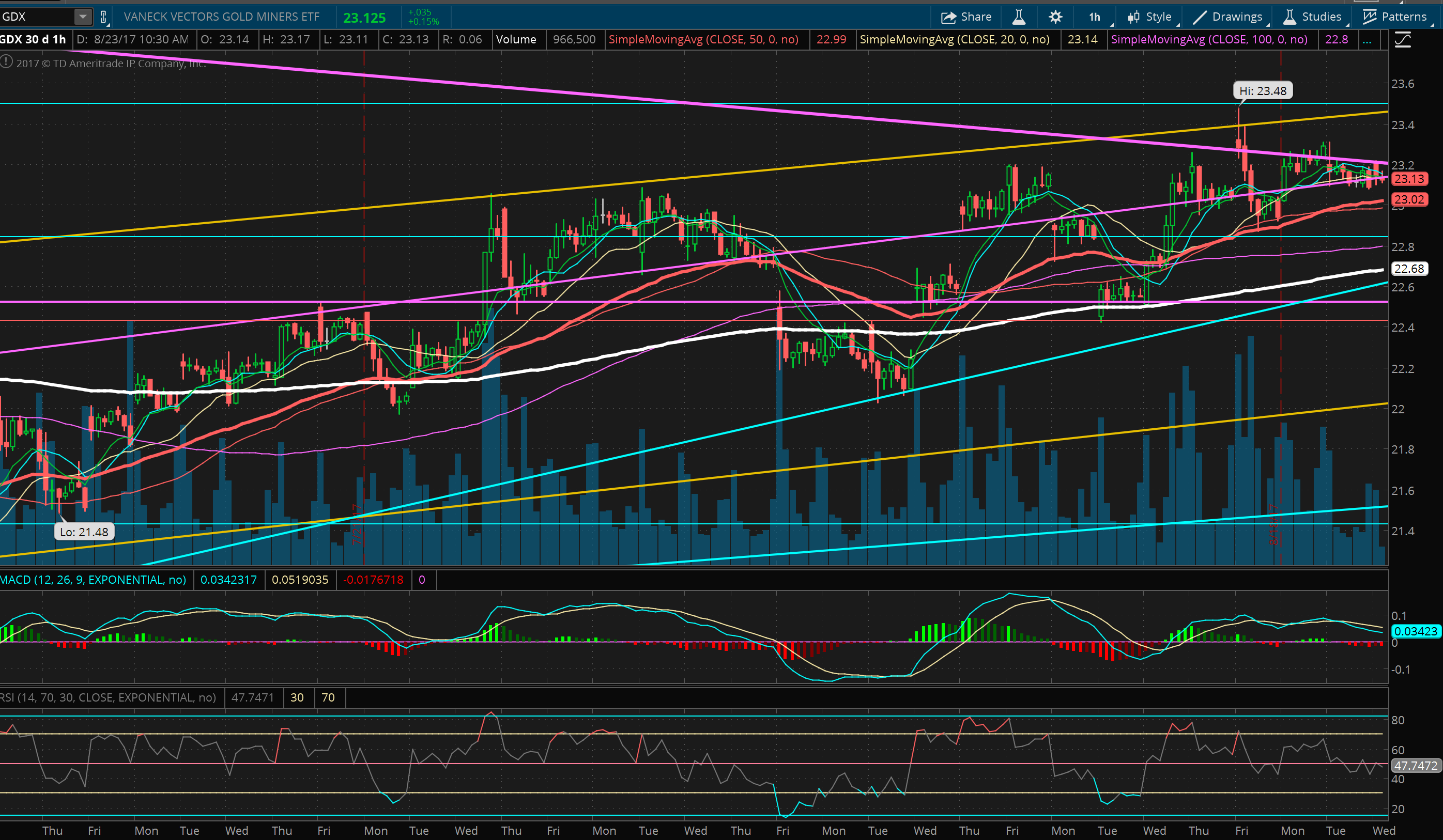 Here’s a 1-Hour chart of GDX – the upper bold purple line connects the tops of February and April – sure would be nice to see GDX punch through!