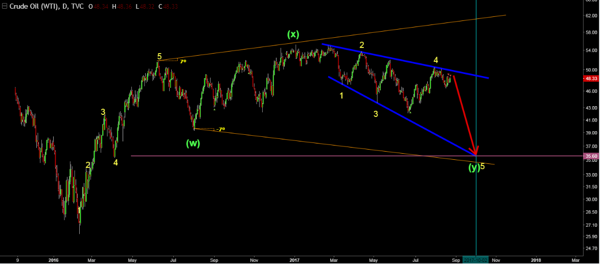 Just see a slight chance for one more leg down in oil. October is when I will be looking for longs.