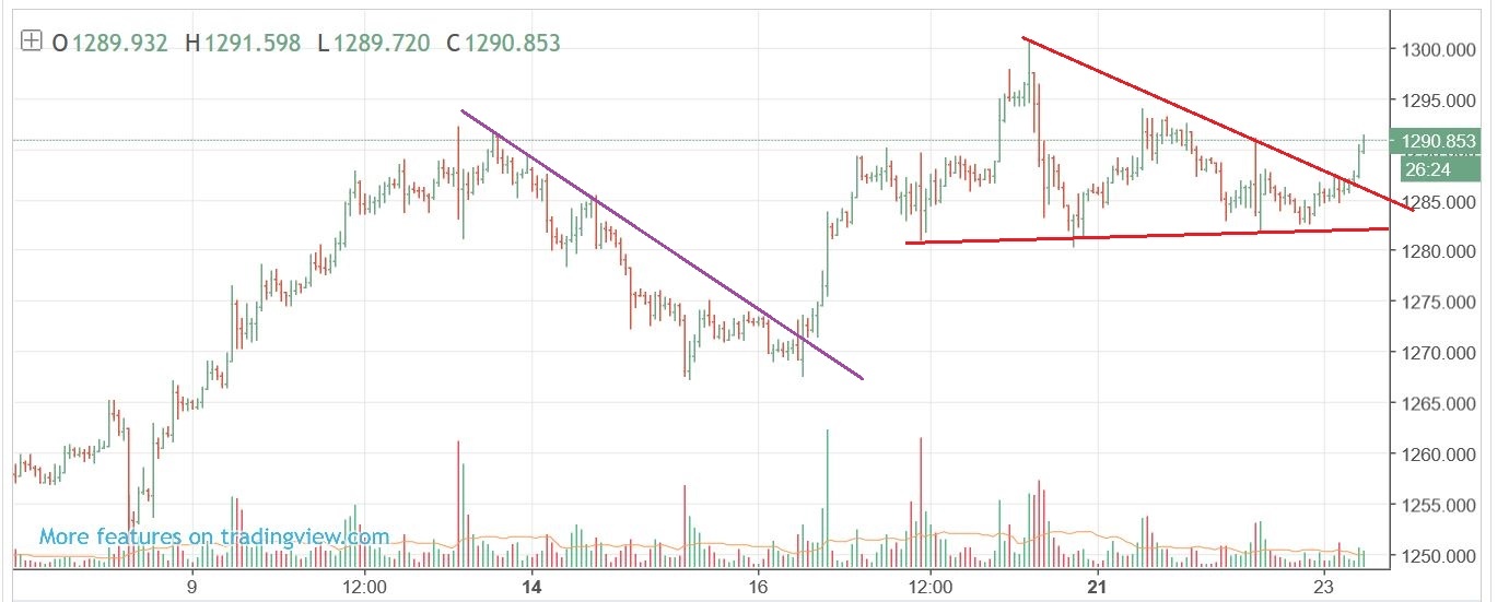 This is the 1 hr chart of Gold pre-market , refresh for a chart- and it does look like a short term bullish break of a down trend.