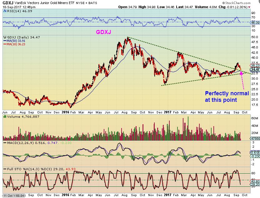 GDXJ SEPT 18— THAT IS WHY I ALWAYS SHOW YOU THE BIGGER PICTURE IN WEEKEND REPORTS. This is GDXJ as of Monday. We want this back test out of the way, and have expected it as a possible scenario, haven’t we? Below $32.50 is a moment when something is possibly a triangle break out failing.