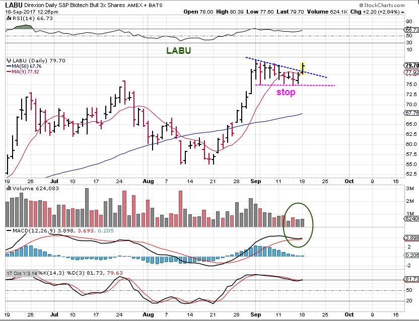 LABU – I caught this chart breaking out, but it closed back at the blue line. Even though it sold off into the end of the day, this looks bullish, and your stop could be placed under the MAGENTA line. I would expect this to run higher,even though it dropped into the close.