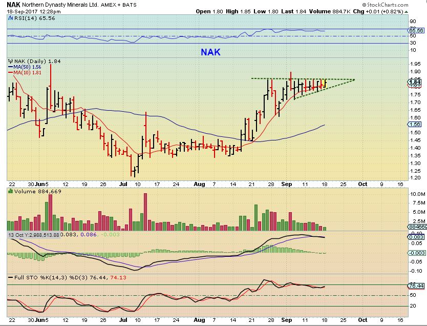 Is NAK really a Bullish ascending triangle? IF so, it is a bullish breakout waiting to happen. This could eventually also double from our Buys down at the$1.30 area in July & August. With a pattern like this, a ‘buy’ is give with a break higher and a stop is placed under the triangle , in case it fails. ( Obviously buying this pre-Fed is tricky, but I know that some are still holding this one, so I wanted to point out the bullish set up). I own this one too.