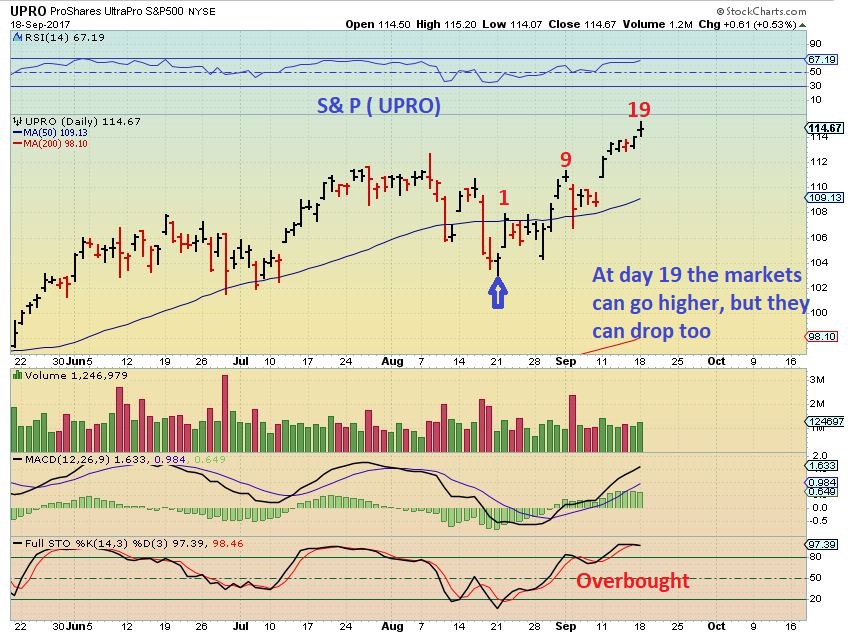 SPX ( Or UPRO) – I’ve mentioned using a trailing stop, and by day 19 we start to look and see if it could be topping. The last daily cycle went sideways from day 19 to 27 and peaked on day 27. On this chart you will see that topping action at the end of July into Aug ( Sideways for 2-3 weeks). It then dropped sharply. Monday was a doji and usually indicates indecision, but this can continue higher. I’d still use a trailing stop here.