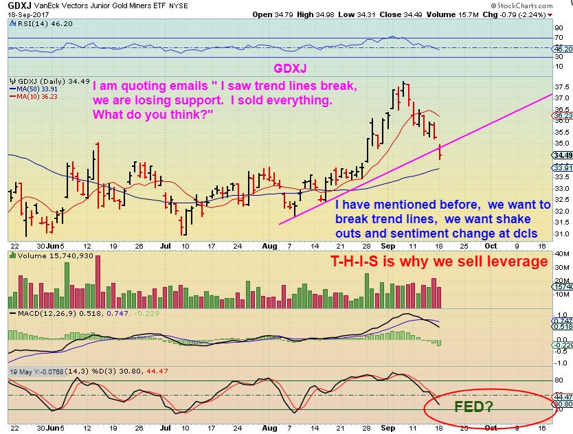 I want to mention something that I hate to bring up as a trading thought, but please understand that crazy world conditions also could lead to crazy surprises. Why not Google “News about the U.N. and N. Korea” this morning. If you wake up one day and N.Korea has fired a missile that lands in a neighboring land, or the U.N. says that the N. Korea antagonistic ways has lead to a ‘response’, all I am saying is that a response to that kind of situation alone could cause GOLD to pop $60 overnight. Would your Miner that is now down 10 cents today stay down under that ‘surprise to the upside”? How would you re-enter a Miner, if they all gapped up 50 cents? Will the gap fill? Is that the DCL? All I am saying is that I sold my leverage for this drop, but I held on to some MINERS, because surprises seem to be coming to the upside. Look at chart of TAHO a week ago, PZG Yesterday, ALO, etc. This sector still looks Bullish to me during a normal pull back, and geopolitical situations are the volatility that could ignite a rally. I want to have at least SOME skin in the game.