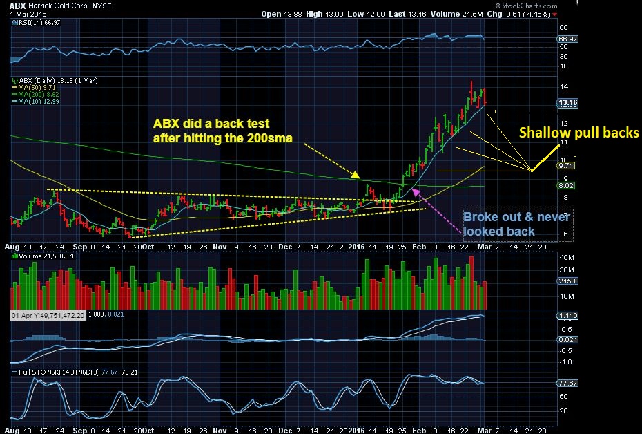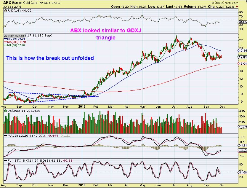 ABX – in the 2016 bull run, a triangle formed on ABX. This resembles the one that we saw on GDXJ. When it started to run, the buy the dips crowd kept it from dropping very deeply.