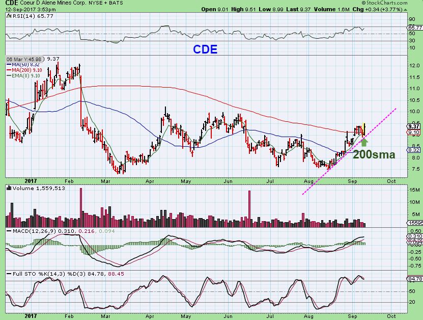 CDE – CDE actually reversed and held the 200sma and a trend line, returning to recent highs. It is not really selling off here and may not drop below the 200sma again.