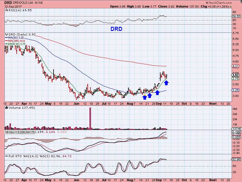 DRD – DRD reversed on Tuesday too, closing up near recent highs too. Miners are giving us a few days of selling and then a surprise to the upside so far. I still own this one too.