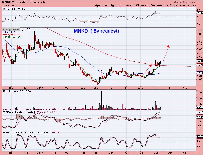MNKD – I do like the way MNKD is ‘progressing’. Notice how it gained the 50sma, and then went sideways, ran up & gained the 200sma, then went sideways again. It looks like it wants to move higher again. My stop would be under the 200sma.