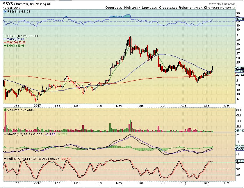 SSYS– Here we see a break out with price above support on the 200 & now 50sma. The down trend is broken, and this is Bullish.