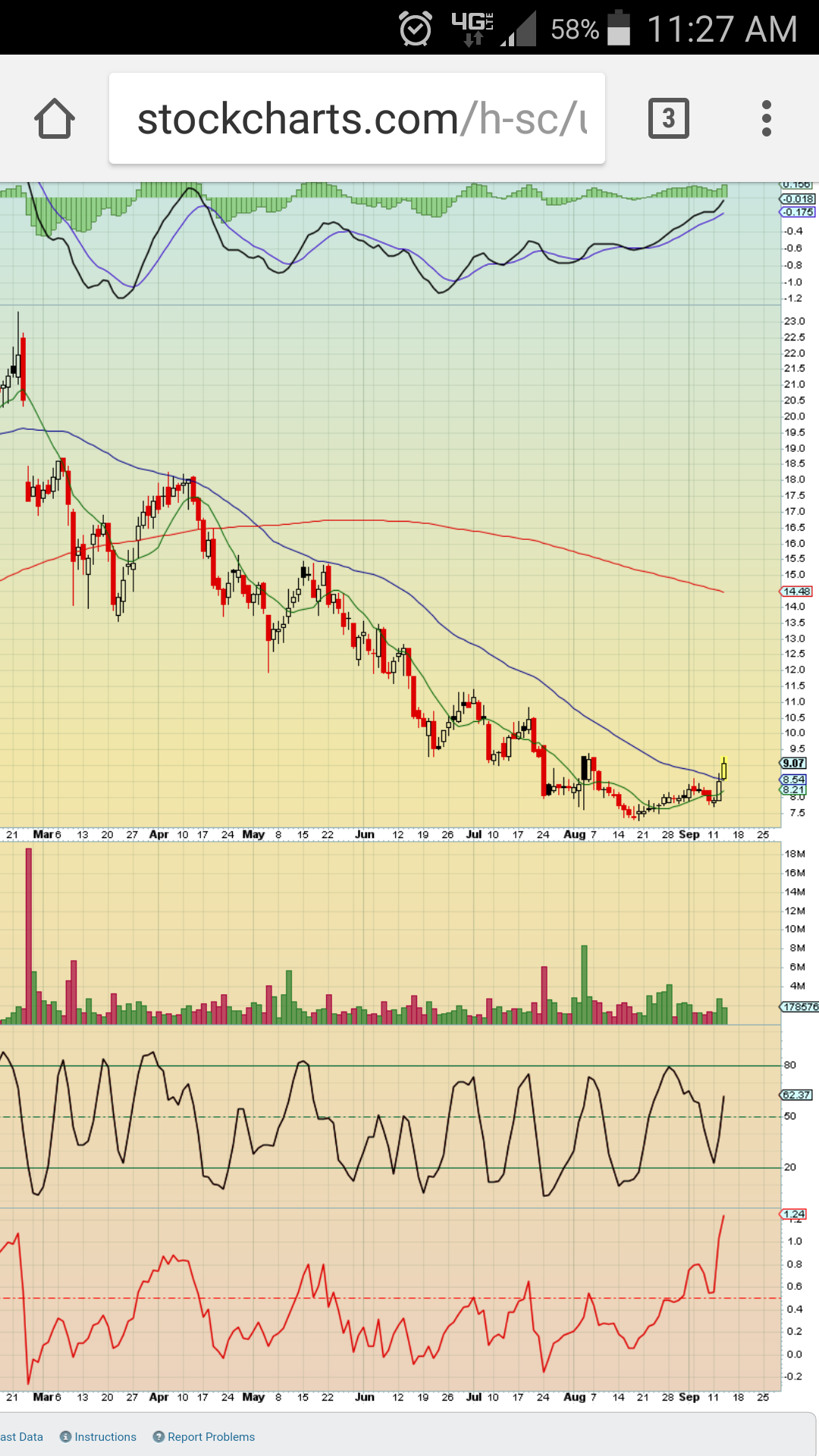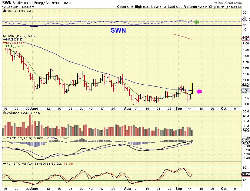 SWN – A $13 stock last December, SWN has a bullish MACD divergence as it breaks out above the 50sma. This chart was captured midday, it closed with over 20 million in volume.