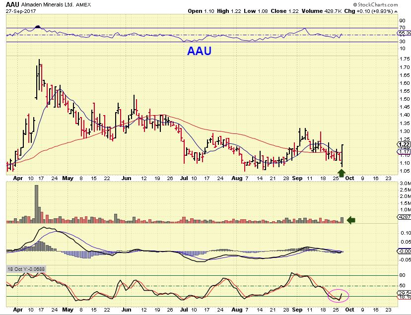AAU – This was a strong bullish engulfing for a day when Gold was down $10 2 days in a row. As I mentioned, some miners are holding up nicely, so I am still expecting the dcl soon. DRD Still didn’t fill that gap.