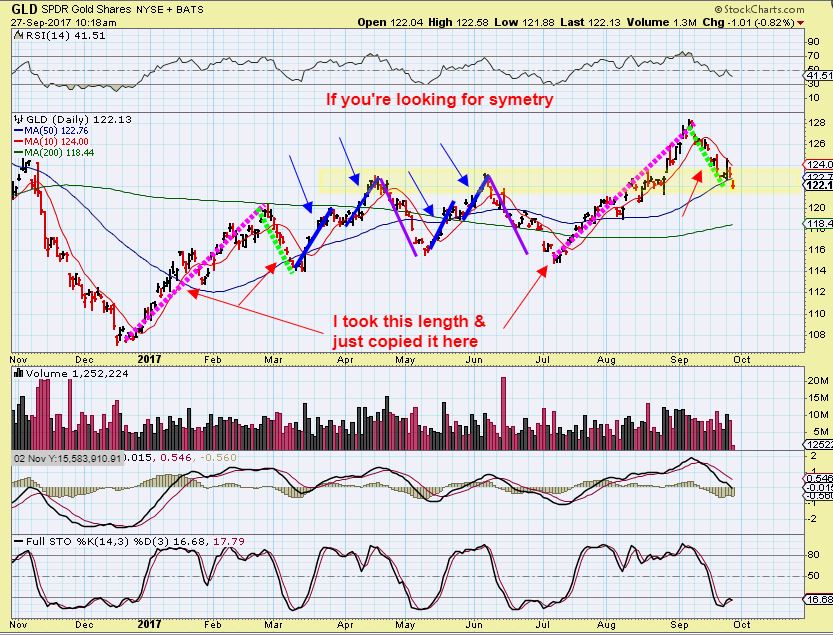 GOLD symmetry pattern – When I look at Gold this way, it looks like we get a 2nd leg down after tagging the 10sma. I’m hoping that this is a shake out below the 50sma yesterday and recovers quickly instead. Also, many Miners are still holding up well. That is encouraging, but as mentioned before, LEVERAGE this late in an intermediate cycle is difficult and is a personal choice. I did buy some hoping for a dcl expecting a good bounce, but a 2 legged drop like these would have me out. Time will tell.