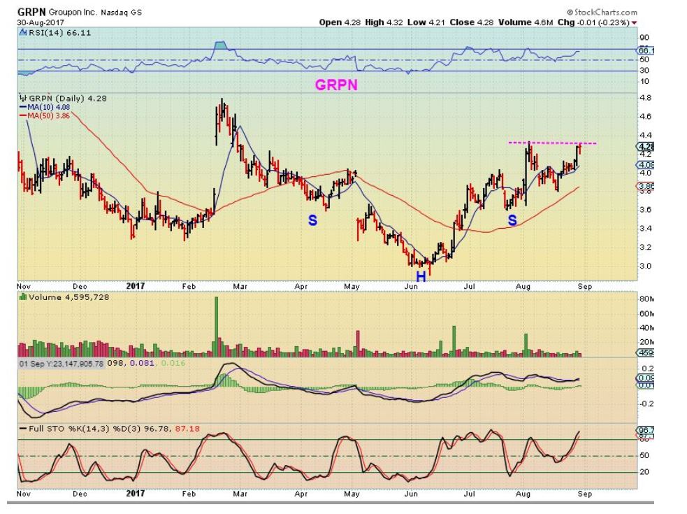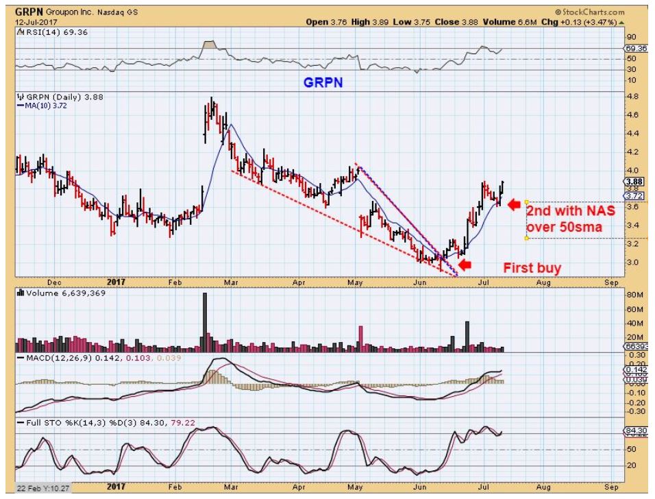 GRPN from July 12 – This was coming out of the lows and offered a 2nd entry. This looks so easy to ride, but honestly, if IPI or TGB drops from $3.90 to $3.50 – people get anxious and may even sell. GRPN dropped from $3.90 to $3.50 in July, but reversed at the 10sma.