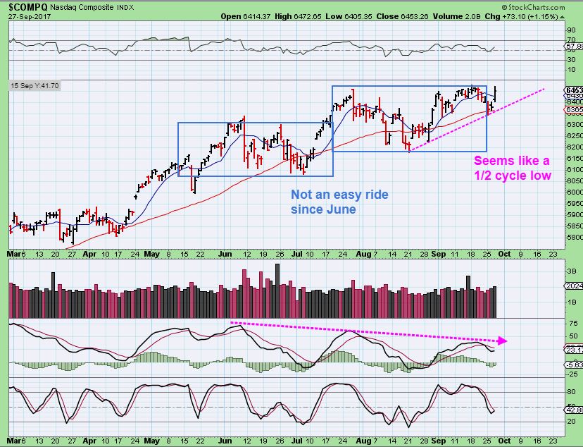 NASDAQ– You can see that we got that drop to the magenta line and now we have a pop. That may be a 1/2 cycle low, but I would still use a trailing stop under that 50sma, because the upside here has been very problematic on each pop to new highs. Take a look at the chart…