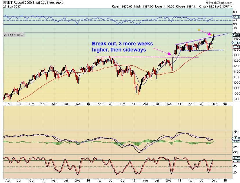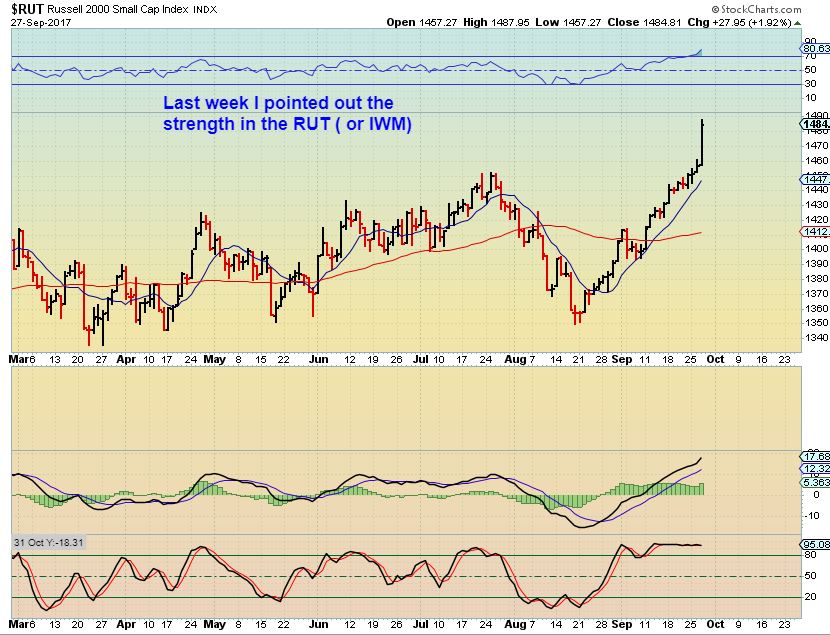 RUT – On Sept 22 I was showing that the Russell 2000 was bullish and had put in a sharp V-Bottom, even though I was seeing weakness in the Nasdaq. Strength was in the small caps after a sharp sell off.