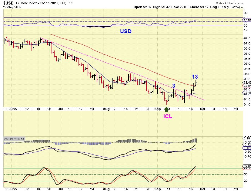 Summary : Those are the various market sectors. Stocks, especially small caps and those in the semi conductor sector, look bullish. See TSEM, MU for example, CY looks like a buy, and FNSR also looks to be setting up. These may only be short term trades of a week or two, since the General Markets could peak & begin their dip into a dcl in the coming weeks. I just don’t like the VIX under 10 when I am long. Oil remains Bullish, NATGAS looks good, watch the inventory reports today. Finally, The USD has that ICL that we were expecting confirmed now, and that means that for the next month or two , it could move higher (or higher & sideways). This can stifle Golds progress, UNLESS a Geopolitical event ( N. Korea Tensions?) pushes it higher. Time will tell on that one. In the meantime, the USD daily cycle tend to run shorter than other ones, so I would expect that it might peak soon & begin to drop into a dcl, and Gold should put in a dcl as the USD begins to peak.