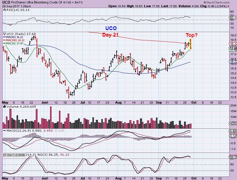 WTIC – On day 18 we can still see Oil move higher, but as it gets later, you want to protect profits if you have been riding this ( Or UWT, UCO, USO). I would sell some & let the rest ride, or use a tighter stop. $54 is a possible target for this run.