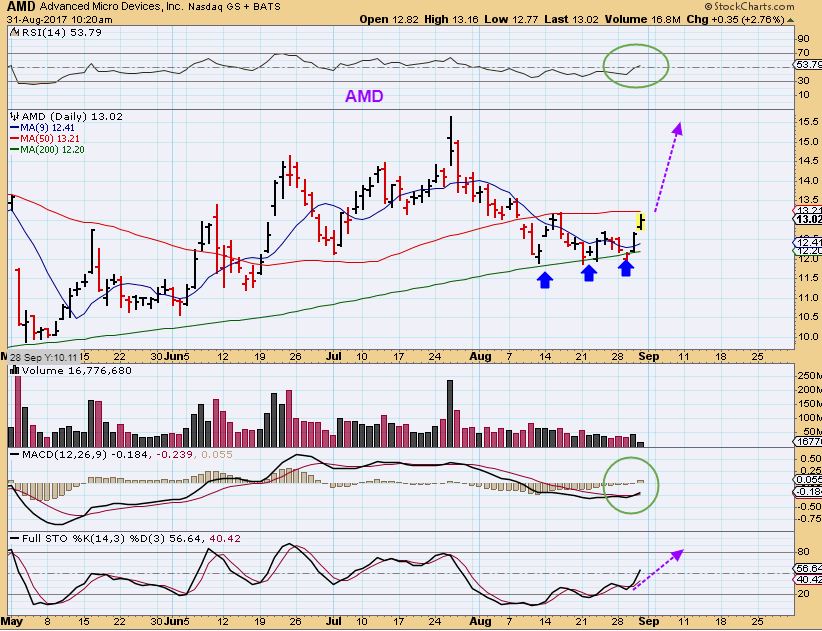 AMD – This held up nicely on the 200sma and looks ready to break out above the 50sma. This buy would place a stop under the 200sma.