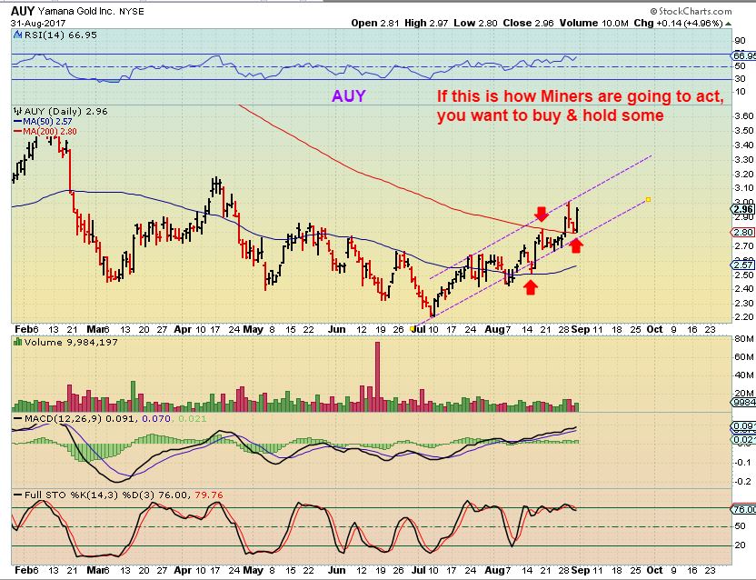 AUY– Is this how Miners are going to progress? If so, you just want to own a small basket and accept the wiggles. Notice that it goes higher, then mainly sideways, and then higher again. I wanted to point out how AUY ( red Arrows) Moved at the 50sma and the 200sma too, and then we’ll examine other Miners currently working in those areas…