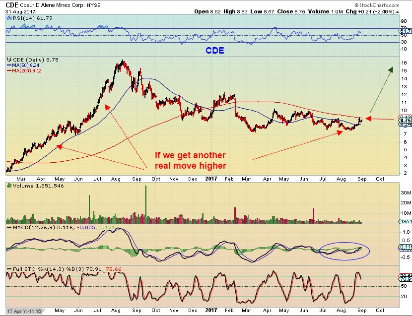 CDE 2016 – Notice how CDE, as it was coming out of the lows, moved higher to the 50sma and stalled, then pushed above it, and next had a dip to test the 50sma. From there we see it move to the 200sma, then it ran along it for days. No major pullbacks along the way, just higher, sideways, higher, sideways. WILL WE SEE THAT NOW? I THINK THAT SOME MINERS ARE MOVING LIKE THAT. IF SO , YOU WANT TO OWN SOME MINERS FOR THE RIDE. We also had strong reversals or dojis that did NOT lead to a long sell off ( GREEN CIRCLES). We have seen that a couple of time recently too.