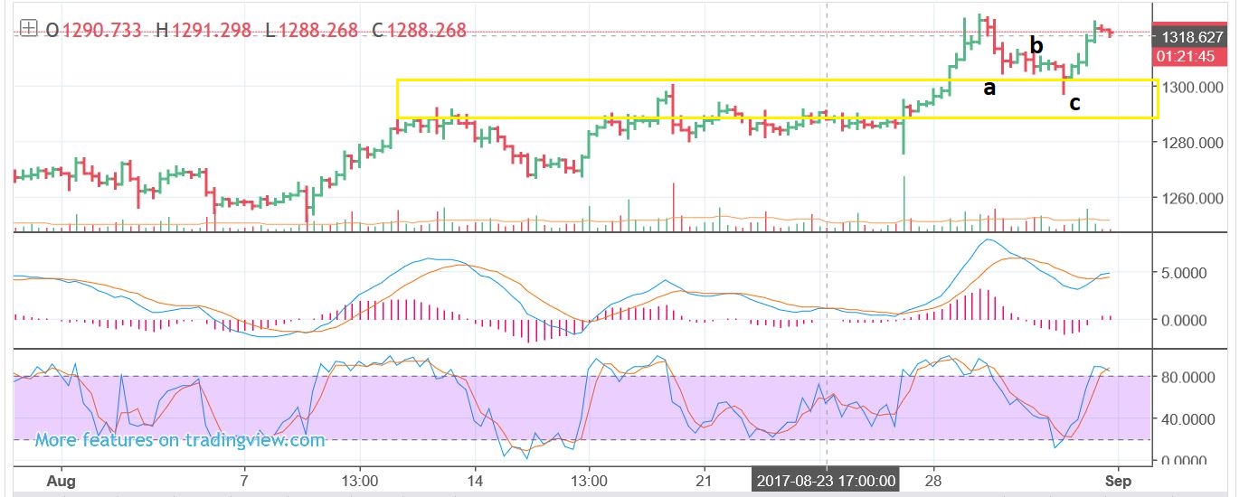 The GOLD expectation was a possible A-B-C drop to that $1290- $1300 back test