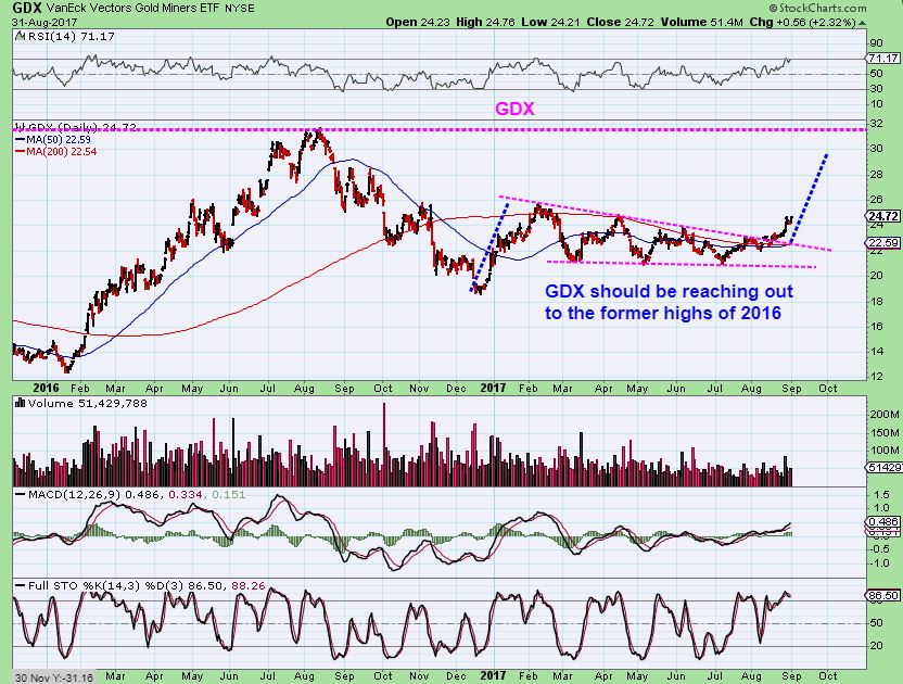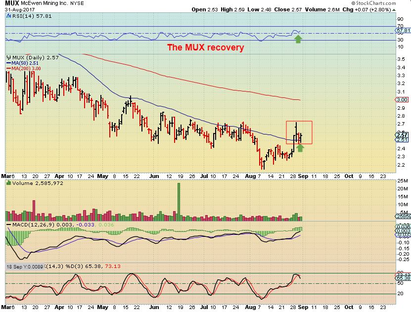 Day by day, my stock screener for miners has another name that pops up as trading above both the 200 and 50 MA´s, signalling confirmed uptrends. Also, my long term charts flashed a buy in MUX this morning, happy to see it and ready to buy as it was one of my best trades in the 2016 run. Already started small buys this morning as I intend to have a very large position as a percentage of my accounts over the next couple weeks. Even though I am well stocked in other miners, I must say I would not mind a good two day walloping to the downside to let me load up on MUX and a couple others, but that might not happen.