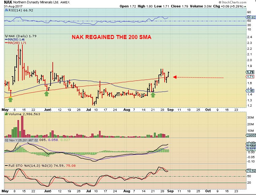 NAK – I added yesterday as overtook that 200sma again. NAK has reacted around the moving averages as expected, but still looks bullish. Miners & Metals sectors have been bullish.