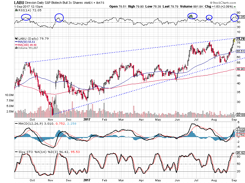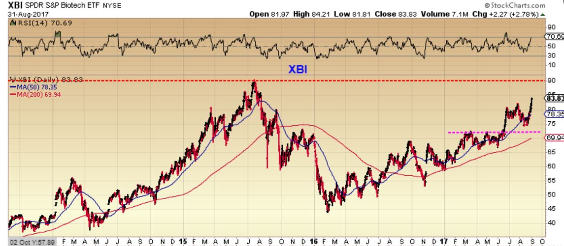 XBI – Continues higher, and when it broke above the magenta line, I said that my first target was that $90 area. It stalled when the general markets corrected, but I believe we are back on track.