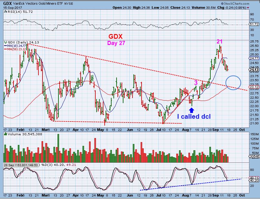 GDX #1 – GDX could drop all the way down to the back test area & 50sma. I have it on day 27 based on the Aug 8th dcl call, and dcls come anywhere from now to into the 30’s lately. On a FED Week, this could easily hit the 50sma by day 30 – 32. That would be Wed -Friday of this week. We have to just see how things play out.