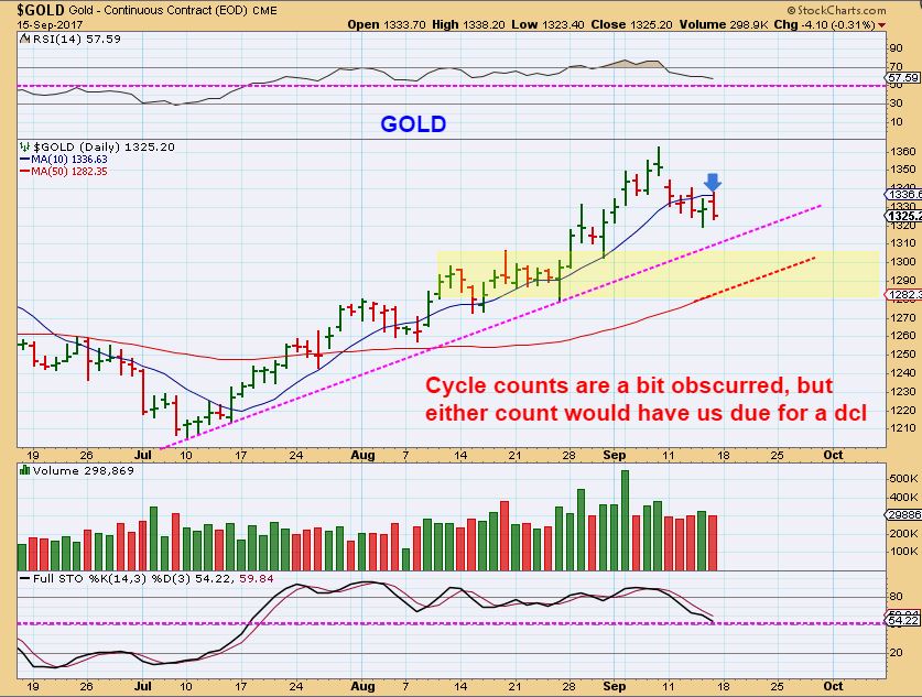 GOLD DAILY – We are due for a dcl, but where will Gold finish selling off? This chart only shows $1320 as a low, but Gold did hit $1315 Thursday , as seen in Fridays report. That would have been close to a tag of the Magenta line, similar to Aug 8th.